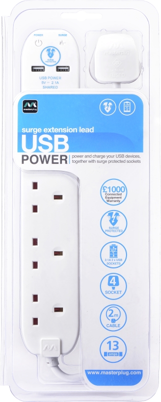 2 Metre 4 Gang Surge Socket With USB