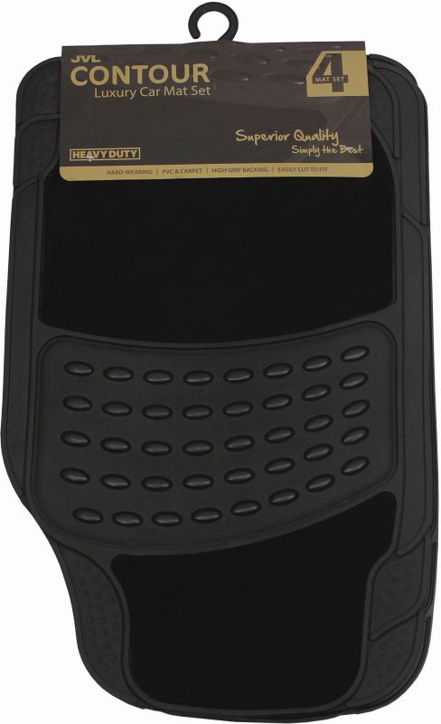 Slip-resistant set of 4 luxury rubber & carpet car mats – textured rubber surface with polypropylene carpeting – with rubber heel area.