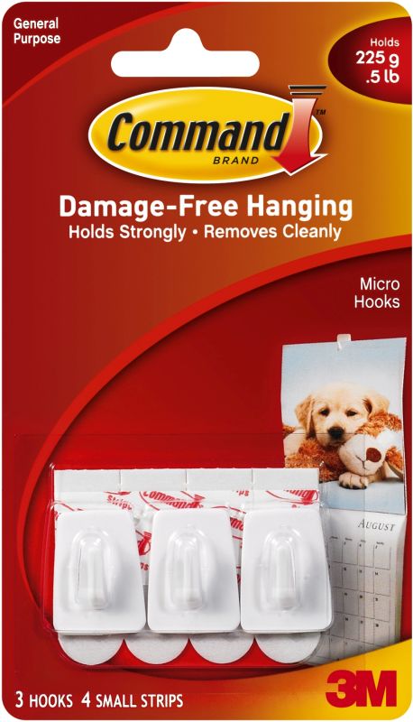 Each Command Micro Hook hook holds up to 225g (1/2lb). Dimensions – (HxWxD) 30mm x 20mm x 10mm.Replacement strips available – use Command Poster Strips.