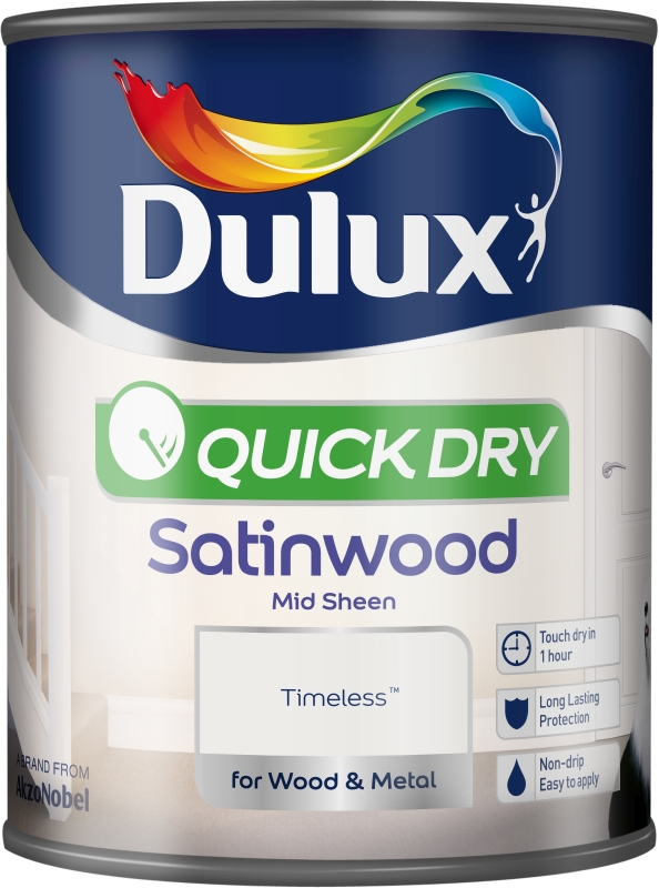Dulux Quick Dry Satinwood creates a mid-sheen satin finish – providing a subtle – attractive alternative to gloss. It is self-undercoating – wipeable – non-yellowing and suitable for use on interior wood and metal – including radiators. Thanks to its Quick Dry – low odour formulation – it’s both convenient and pleasant to use.