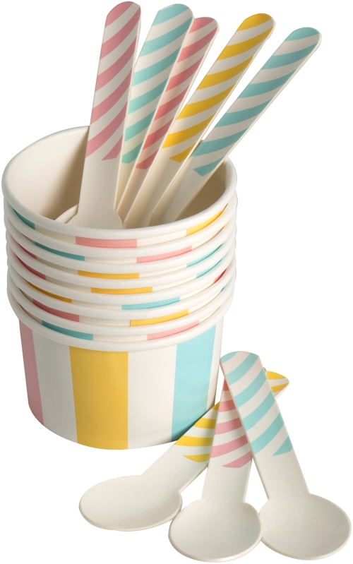Set of 8 paper tubs & spoons. Biodegradable – compostible and printed using soya based inks – making them safe for you and the environment.