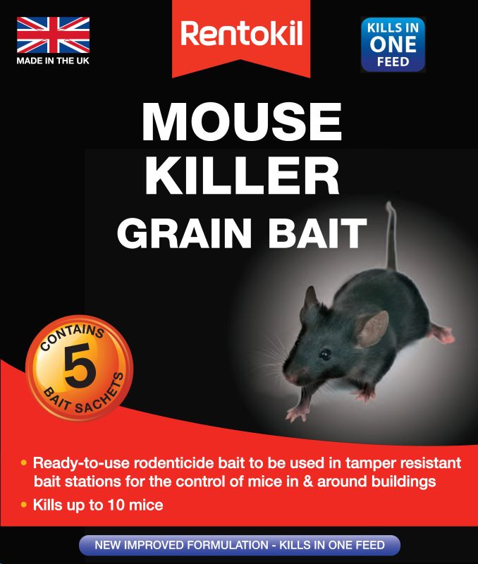 Rentokil Mouse Killer Grain Bait is a specially formulated whole wheat grain in a small, easy-to-use sachet. With an active ingredient that’s highly effective against mice infestations. This ready-to-use rodenticide bait is to be used in tamper-resistant bait stations for the control of mice in and around buildings. For Indoor and outdoor use. Always read packaging before use.