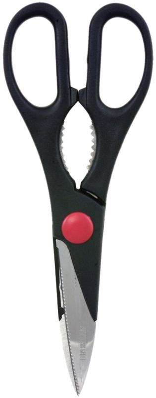 Comfy grip handles. Serrated edge for tough materials. Grip for stubborn bottle tops. Stainless steel blades.