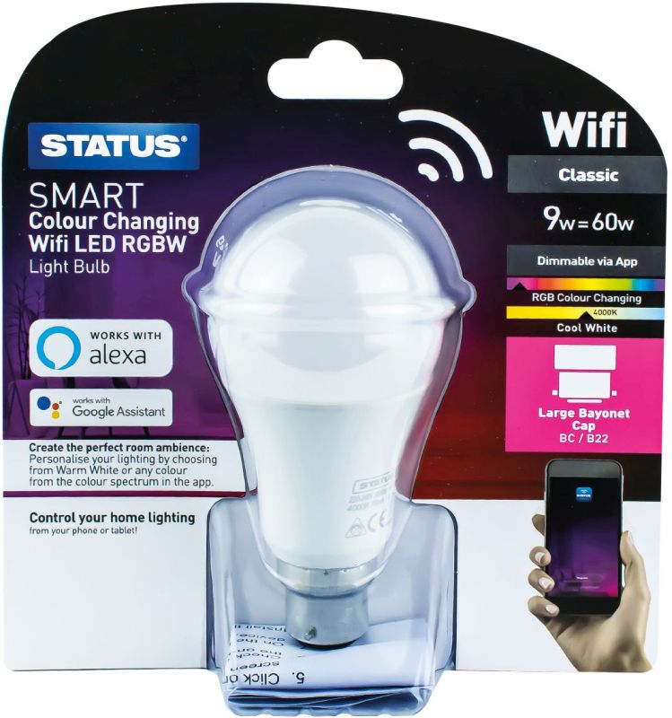 Fully compatible with Alexa and Google assistant – this wifi enabled smart bulb will bring your home into the 21st century. This highly efficient 9 watt LED bayonet cap bulb is made with pearl glass and provides light equivalent to a 60 watt incandescent filament bulb. This smart bulb is also dimmable and has warm light – cool light and daylight colour temperature settings – making it perfect for use in any room in the house. If you have more than one bulb – you can also group them together so you can control multiple lights at once – as well as set schedules and timers.Light your home in a versatile and environmentally friendly way with LED lighting. LEDs are very energy-efficient – using up to 90% less energy than incandescent bulbs and they also have a life expectancy of up to 50 times longer than traditional bulbs. LEDs have the advantage of producing a lot less heat – as well as offering the choice of a warm golden glow or a cooler white light – meaning you can find the best lighting tone to suit your home. There is an LED equivalent for most bulb cap types and bulb shapes that will be suitable for your light fittings.