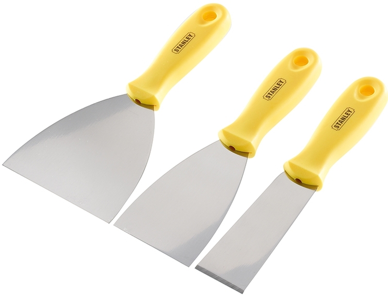 A stripping knife with a mirror polished steel blade attached to a yellow polypropylene handle. For stripping wallpaper.