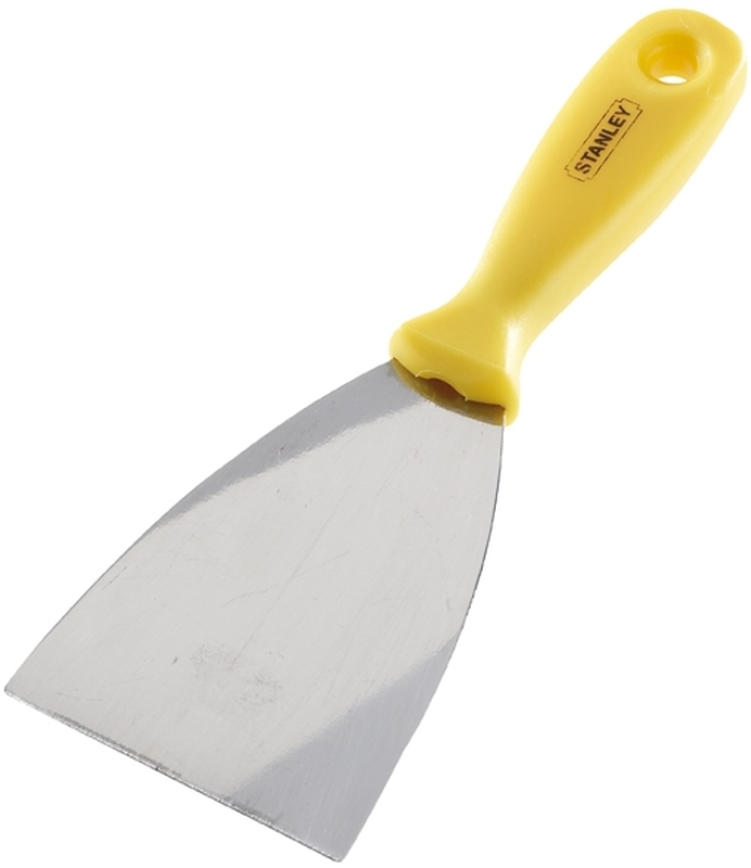 A stripping knife with a mirror polished steel blade attached to a yellow polypropylene handle. For stripping wallpaper.