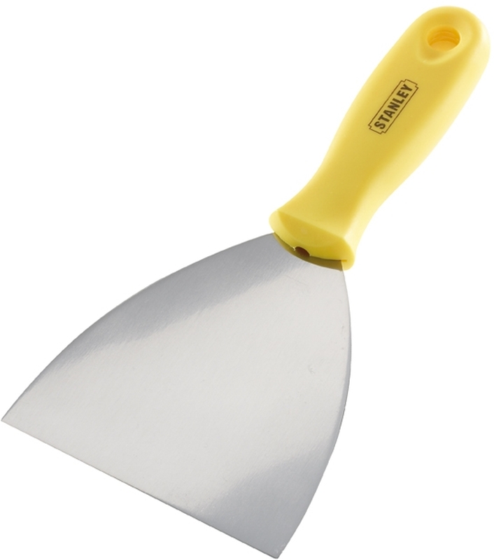 A stripping knife with a mirror polished steel blade attached to a yellow polypropylene handle. For stripping wallpaper.