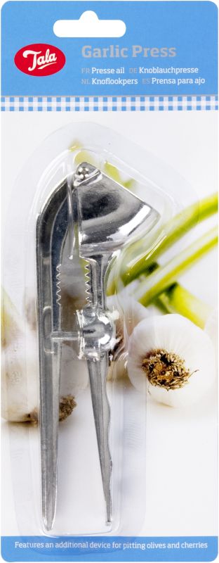 Tala essential garlic press. Features an additional device for pitting olives and cherries. This product is not dishwasher safe.