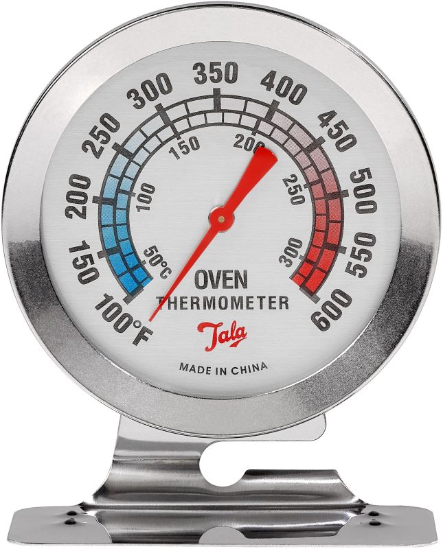 Tala Stainless steel oven thermometer. High impact shatter proof case. F and C readings. Stands or hangs. Rotating dial allows the thermometer to stand or hang in the Oven. Easy to read. Remove from oven during self cleaning process