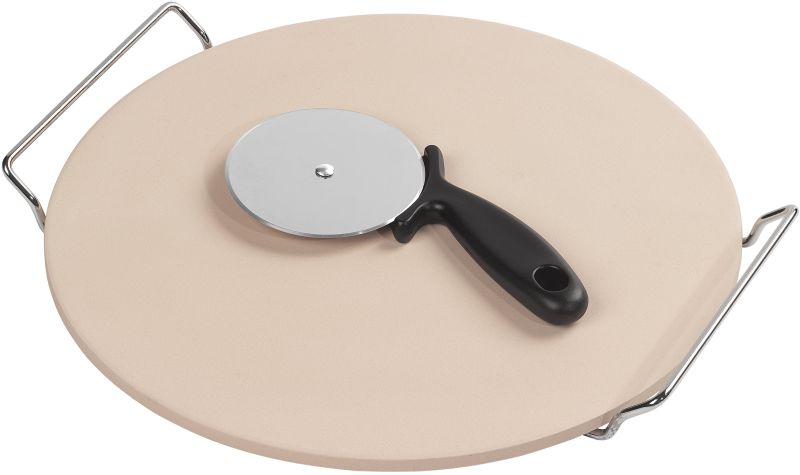 Cook your pizza to perfection with this 32cm pizza stone and cutter. Whether you are getting crafty and making your own pizza or heating one up – this Ceramic base heats evenly – absorbs moisture – to ensure a crispy base. The ceramic holds in heat so pizza can stay warm for long after cooking. Then use the stainless steel cutter to slice and serve your warm and crispy pizza. Can also be used for cooking other baked goods such as baguettes – croissants and more.