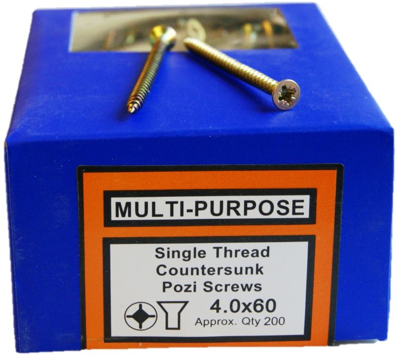 Zinc yellow passivated single thread pozi countersunk screw. Suitable for use in many materials such as timber – chipboard – MDF – PVCU – plastic – fibreglass.