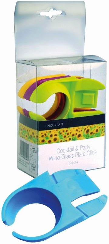In sturdy plastic – these wine glass plate clips are an ingenious solution for parties – barbecues and functions. Clip enables glass to attach to plate keeping the other hand free for eating. Assorted set of 6.